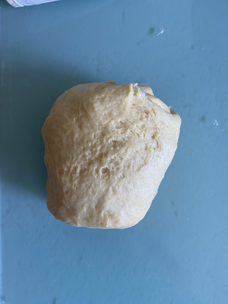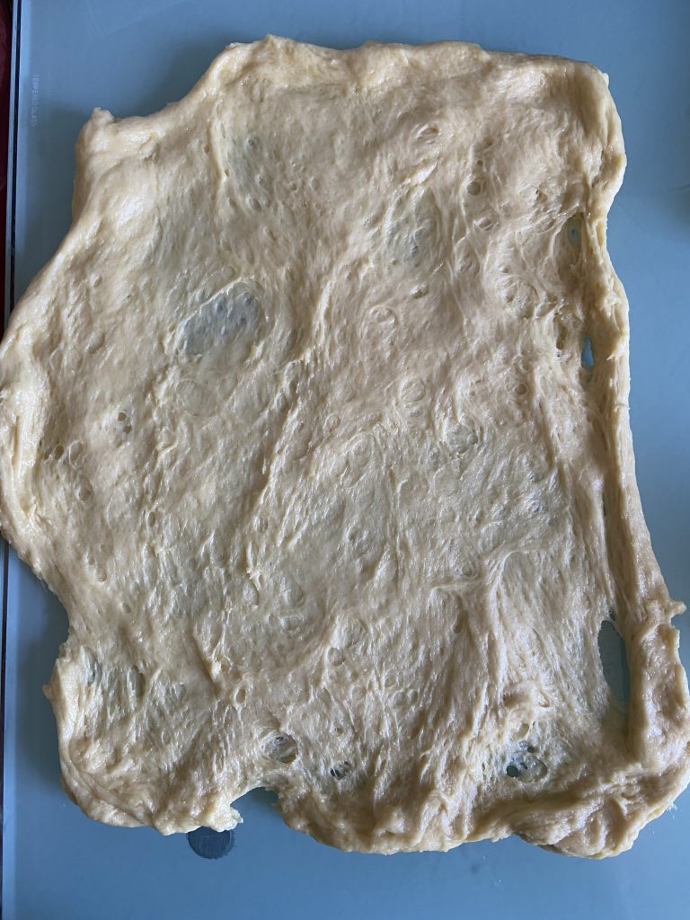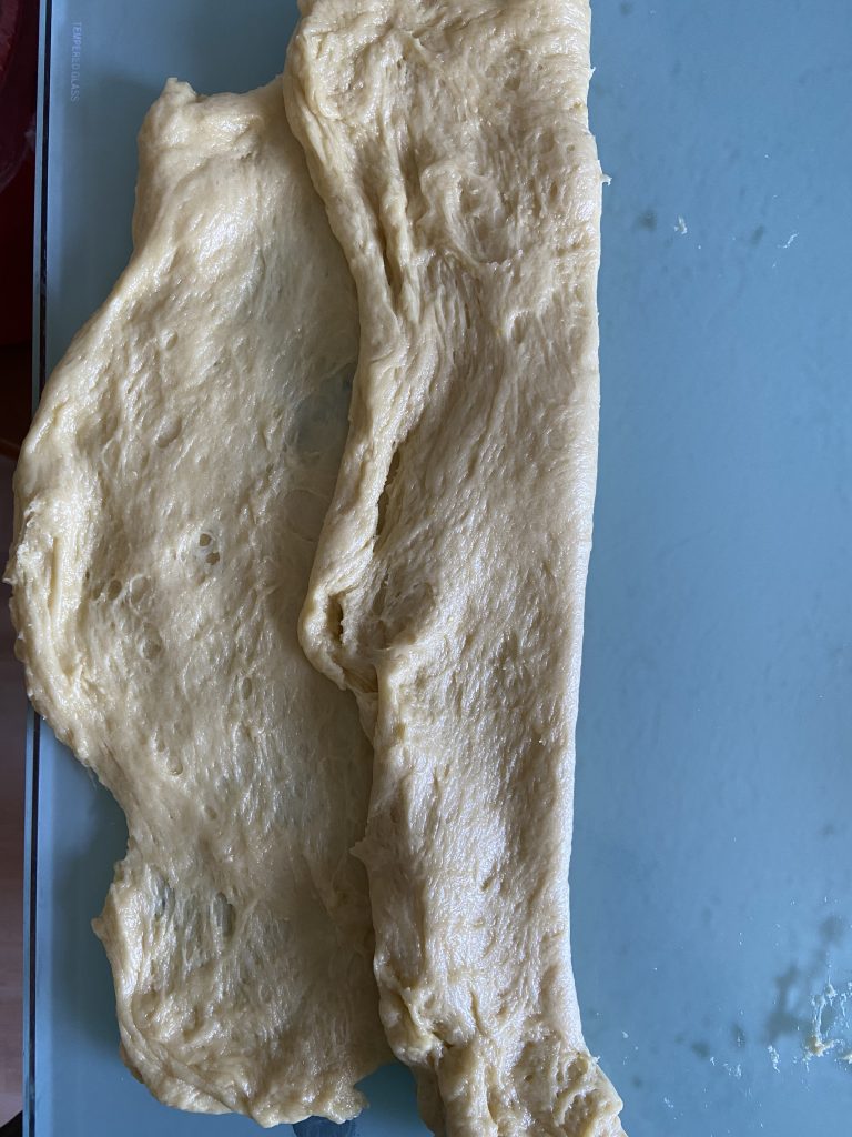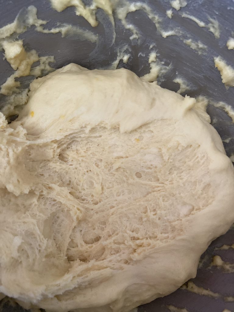 Такий прийом дасть краще розвинути глютен у тісті. Зауважте, що ні масло, ні солі ми ще не додавали. Результат тіста після години скисання.