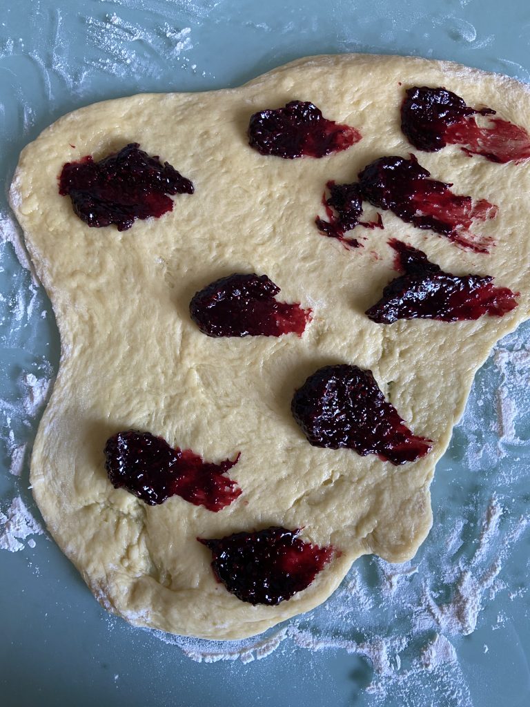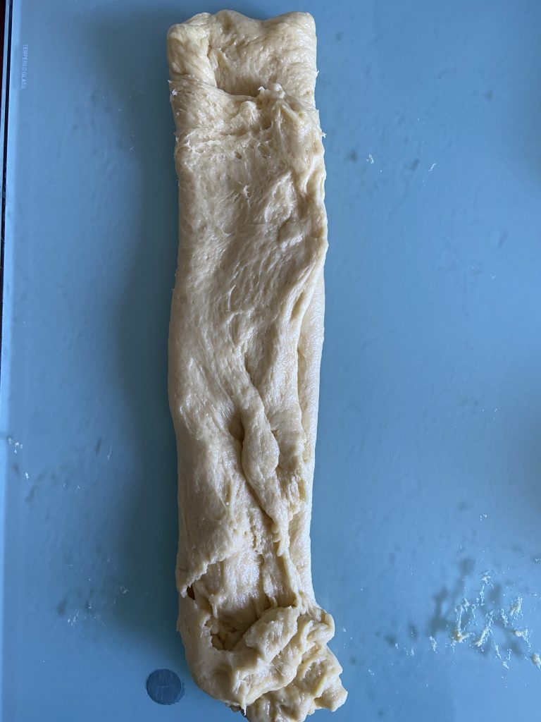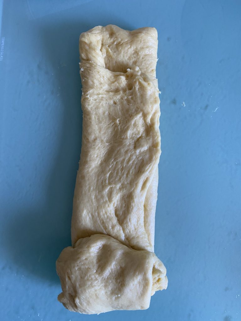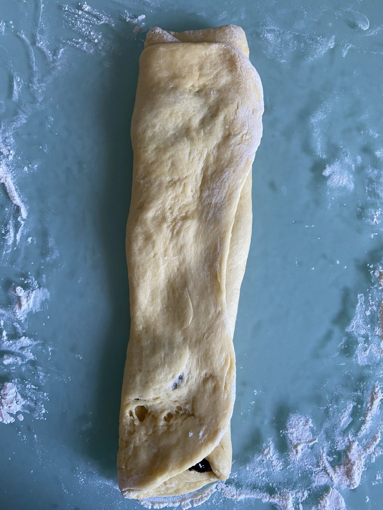 Складаємо тісто. Правий край загортаємо до центру, потім накриваємо лівим краєм зверху. Довший край закручуємо у рулет. Округлюємо заготовку.